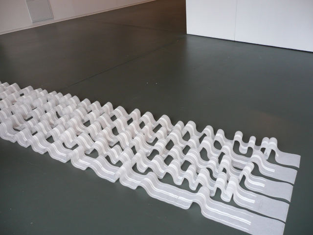 Holzschnitt, Japanseidenpapier, 5 x 10m x 12cm, 5m x 70cm, Installation, Hochdruck vom Balsaholz, Druckfarbe weiß, wasserlöslich, 2007